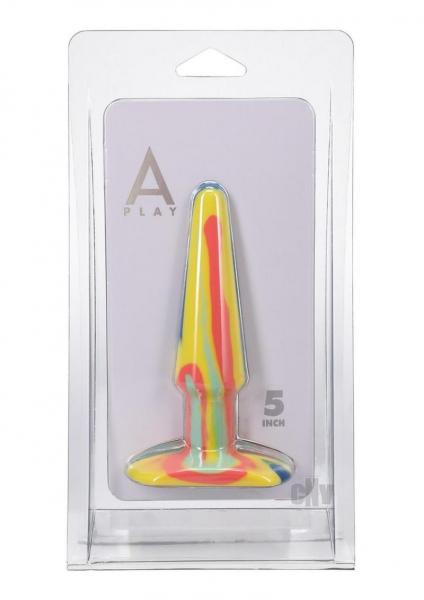 The A-Play Groovy is a soft multi-colored anal plug made of health-grade silicone. Its tapered tip and wide base make for safe, comfortable play, and its firm-yet-flexible feel allows for a little wiggle. Each plug is unique and has its own variation of the color pattern.Features Made from Health-Grade Hygienic Silicone Tapered Tip for Easy Insertion Wide Base for Safe Play Warms to Body Temperature Firm Yet Flexible Easy to Clean; Top Rack Dishwasher-Safe Hypoallergenic, Nonporous, and Odorless Phthalate-Free, Body-Safe Dimensions Total Length: 4.25 in. (10.8 cm) Insertable Length: 3.75 in. (9.5 cm) Width/Diameter: 0.75 in. (1.9 cm) Circumference: 3 in. (7.6 cm)