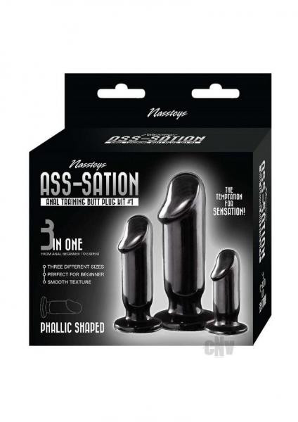 Ass-sation Anal Training Butt Plug Kit #1 features three individually packaged phallic shaped butt plugs of graduated sizes to make anal training easy! andnbsp;Great for beginners, the user may start with the smallest size plug (about 3 inches) then graduate to the medium and larger size in the kit. These smooth, sleek plugs are flexible enough to be worn for periods of time if preferred. andnbsp;Please clean before and after each use with toy cleaner and use with water-based lubricants. 3 Different sizesPerfect for beginnerSmooth texturePhallic shapedPhthalates freeWaterproofMaterial: PVCSize: Small: Height - 3, Width - 1 Medium: Height - 4, Width - 1.2 Large: Height - 5.5, Width - 1.6