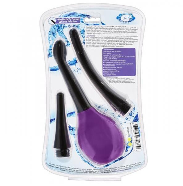 Cloud 9 Fresh Plus Flex Tip Anal Douche Kit. The Anal Douche and Enema System makes preparing for anal or vaginal intercourse quick and simple. This soft, easy to use enema bulb is a handy device to clean the rectum or vagina. Ideal for anal and vaginal douche cleansing prior to play. This Cloud 9 cleansing bulb includes a premium soft flexible tip that contours to your body. <br /><br />How to use: the Cloud 9 Fresh Plus high quality kit is completely safe and brings great results in the comfort of your own home. Our enema is composed of two parts: the first is a flexible, 4 inches, 5.75 inches or 7 inches nozzle that is easy to insert and comfortable to remove. The second is a 11.8 ounces flat bottomed bulb that was specially designed to resist tipping over. Simply fill the bulb with your desired fluid, insert the tip, and slowly press the bulb to release the liquid. When you are finished,the parts detach for a quick cleanup in warm, soapy water. <br /><br />Specifications: flat bottom, anti tip design. 11.8 ounces. Includes 3 Soft Nozzle Tips. Nozzle cleaning tip lengths: 4 inches, 5.75 inches and 7 inches. Purple with Black Tip. Soft PVC EZ Squeeze Bulb Nozzle. Curved enema soft tip for comfort. 5 way open holes at angled nozzle tip for best water dispersion. One year consumer warranty. Weight 5.4 ounces. Height 7 inches with tip, width 2 inches, length 2.75 inches. <br /><br />Care and cleaning: thoroughly clean the Cloud 9 Anal Enema Douche before and after each use. You can wash it with antibacterial soap or use Cloud 9 Toy Cleaner. Store in a cool dry place after cleaning. <br /><br />Warning: Cloud 9 Novelties are intended for use strictly as adult toy novelties. They are not intended for medical use and have not been clinically tested. No medical claims are warranted or implied by the use of these products. One year limited warranty. Cloud 9 Novelties, Pennsauken NJ 08110. Manufactured for WTC MFG, LLC. Made in China.