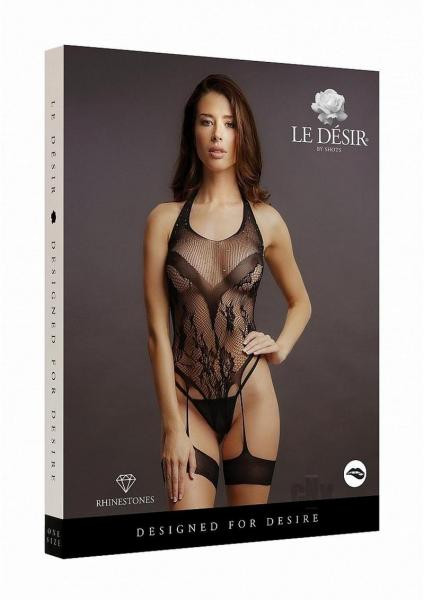 Unlock next level allure in this audaciously erotic, lace pattern, halterneck Crotchless teddy. The deep-V, fishnet neckline is adorned with beautiful rhinestones. The attached opaque leg garters mean one thing's for sure: all eyes are on you. The soft, stretchy, fabric makes it a comfortable, and easy fit. Thong not included. * Rhinestones * Attached garters * Open crotch * Halter neck * Soft and stretchy