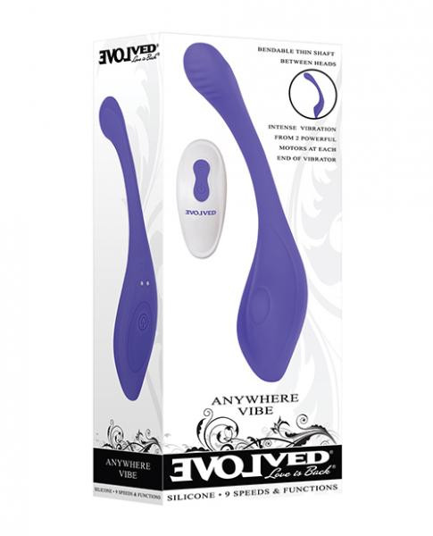 Evolved Anywhere Vibe from Evolved Novelties. Two powerful vibrating heads with a poseable arm in between give you the freedom to customize your play time for intense external and internal pleasure where you want it most. On one end is a slim bulbous head perched on a gently curved arc which is ideal to reach your internal erogenous zones on the other end is a generous bulging oval that delivers external vibes, its flat edges creating a profound hum that resonates and connects to your deeper erotic centers. Enjoy your experience hands free with the ergonomic remote and take your double feature into the bath with you as it is fully submersible. Specifications: dual end flexible, poseable vibe. Slim bulbous head on one end. Bulging oval shape on the other. Intense internal and external pleasure. Bendable thin shaft between heads. Two powerful motors controlled together. 9 vibrating speeds and functions in each motor. Stimulating textures on both heads. Vibe height 7.75 inches, depth 1.24 inches, width 1.72 inches. Remote control height 3.02 inches, depth .83 inch, width 1.26 inches. Weight under .5 pound. 4.5 inches insertable length. 30 feet remote control range. Made from creamy smooth silicone. Remote control made from ABS plastic and silicone. Blue LED illuminates button when in use. Waterproof vibrations and submersible. Magnetic rechargeable, USB cable included. Remote rechargeable with included cable.