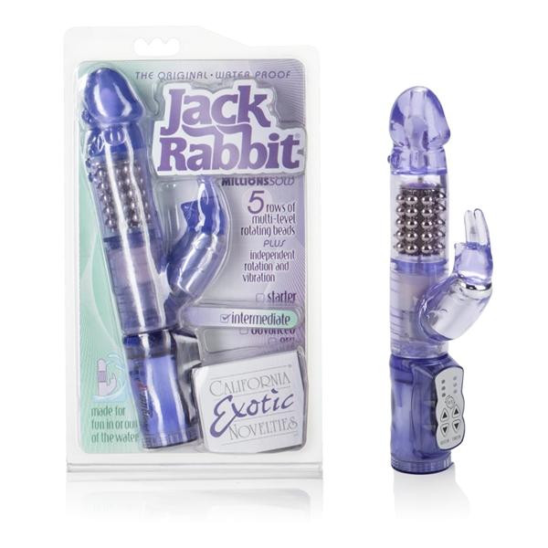 The original is now better then ever! The Waterproof Jack Rabbit is made of soft jelly. The usable length of the penis shaped shaft is 5.25 with a diameter of 1.625. The shaft has five rows of rotating synchronized internal beads. The clit teasing rabbit has a powerful internal bullet. With soft flickering ears, it will get you perked up in no time. The control base has individual buttons for shaft gyration speed and rabbit vibration. With a reverse button for gyration, you can really get all you need. The EZ load battery case requires three AA size batteries, not included. Get out of the ordinary and hop into the extraordinary!