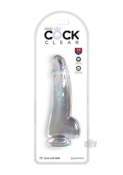 Clearly the best! Created to heighten your pleasure experience, this specially crafted formula is virtually odorless, non-sticky, and easy to clean. King Cock Clear combines a translucent dildo with a realistic cock design. The luminous clarity and lifelike form will fulfill all your fantasies! With its flexible shaft, detailed veins, and defined head, King Cock Clear will engage your senses visually and physically. The powerful suction cup base sticks to nearly any flat surface and makes every dildo harness compatible.Features See the Innovation: An incredibly pure, translucent material Feel the Realism: A lifelike design with every vein, shaft, and head carefully handcrafted Enjoy the Action: A powerful suction cup base sticks to nearly any flat surface Experience the Advantages: Effectively harness compatible with the sturdy suction cup detail Specifications Product Overall Length: 7.5 in. (19cm) Insertable Length: 6 in. (15.2cm) Insertable Diameter: 1.7 in. (4.4cm)
