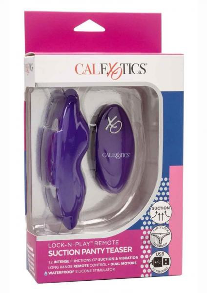 The Lock-N-Play Remote Suction Panty Teaser is a sensually sucking panty teaser paired with a playfully mini remote for adventurous pleasure seekers. The powerful panty teaser features a suction teaser, magnetic tabs, 12 functions of vibration, and remote control. To keep the perfect placement through even the most active playtime, the panty teaser has magnetic tab wings to securely attach to almost any panty. The discreet remote makes it easy for you or your lover to flicker through the vibration and suction functions with the touch of a button. Whenever or wherever passion takes you, this passionate panty vibrator`s 32.75-foot radius range and 12 intense functions of pulsation are ready for playtime. Use the discrete controller or the button on the panty teaser to cycle through 12 functions of thumping pulsations with synchronous vibrations. Whether you choose to stay in control or you have left pleasure in your partner`s hand, this powerful teaser is sure to deliver knee-shaking sensation. From blushing beginners to erotic experts, this blissful bullet vibe adds versatile vibrations to any toy box. Recharge your passion in only 1.5 hours with the provided USB cable for up to 45 minutes of high-intensity stimulation.