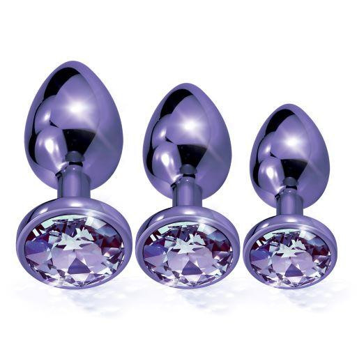 Nixie Metal Plug Trainer Set Purple Metallic from Global Novelties. Nixie Metal Plug Trainer Set Pink Metallic from Global Novelties. Adorn your derriere with a dazzling purple jeweled anal plug! Smooth plated slick metal finish plugs in light weight Aluminum alloy. Graduated sizes in this anal training kit let you start small and train your way up to more adventurous pleasures. Tapered tip and seamless smooth, seamless material assure an easy insertion. Free bonus storage bags for each plug. Easily warmed or cooled for temperature play. Body safe and eco-friendly. Small Butt Plug measures 2.75 inches by 1 inches, medium butt plug 3.2 inches by 1.3 inches and a large butt plug measures 3.75 inches by 1.57 inches. Categories: Anal Toys, Small, Medium Butt Plugs, Sex Toys for Couples, Sensual Kits, Anal Trainer Kits. 2022.