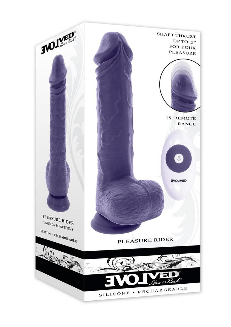 Pleasure Rider Experience deep satisfaction with this large thrusting vibrator that`s crafted with a life-like crowned head and realistic vein textures. The girthy shaft made from soft and stretchy silicone thrusts with exhilarating multi-speed power and is designed for hands-free possibilities with a robust suction cup base and ergonomic remote control. 8 vibrating speeds and patterns in the head 5 thrusting speeds andamp; patterns in shaft, 0.5 thrust Made from phthalate andamp; latex-free silicone andamp; ABS Height: 8.75, Depth: 3.38, Width: 2.70 Insertable length 6.5, able diameter 1.75 Remote: Height: 3.15, Width: 1.69, Depth: 0.90 15` remote range Waterproof USB magnetic rechargeable, cable included Remote uses CR2032 battery, included