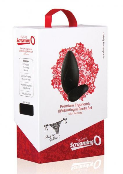The My Secret Screaming O Premium Ergonomic Panty Vibe features a 20 FUNction contoured shaped, flexible vibe that secretly slips into a matching pair of lace panties, designed to comfortably fit up to 60-inch waists. This form-fitting flex vibe features a soft-touch feel, is 100% waterproof, phthalate and latex free, and offers over 60 minutes of deep rumbling vibration time. My Secret Premium Ergonomic Panty comes with a discreet rechargeable toggle remote, but play can be enjoyed with or without it. Whether alone, or with a partner My Secret Screaming O Premium Ergonomic Panty Set provides for a next-level pleasure experience.