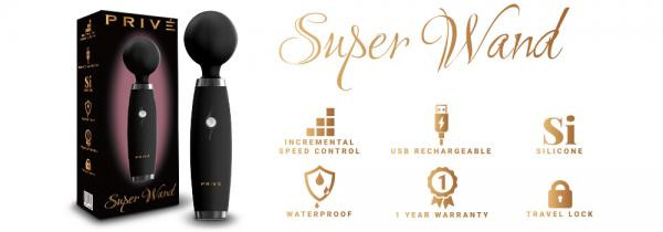 Prive Super Wand from Prive Toys. Get revved up and ready to go with the Super Wand! This intense turbo charged motor has a unique incremental speed vibration and 360 degree flexibility designed to target all the right spots. Features: Intense incremental speed vibration. Made using Medical Grade Silicone and ABS Plastic. Ultra hygienic. Easy to clean. Size Length 8.5 inches. Diameter 2 inches. USB Rechargeable. Waterproof. Travel lock feature: triple click on/triple click off. 1 Year Warranty. UPC: 746092197333. Categories: Vibrators, Eco-Friendly Sex Toys, Rechargeable Vibrators, Magic Wands, Body Massagers, Health and Beauty Aids, Sex Toys for Women. 2024