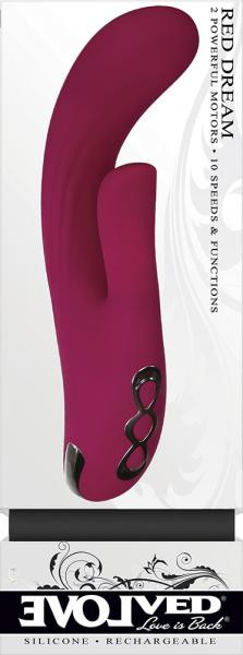 Red Dream Red Vibrator from Evolved Novelties. This dual vibe takes you on a curvaceous journey where the destination is pure pleasure! With two powerful motors that operate independently, you can customize your ride, even underwater as its completely submersible. Large and girthy, expect deep satisfaction from this flexible shape that moves with your body and lets you amp up to ten when you want it most. Clean with Evolved Toy Cleaner and a warm water rinse. Features: curved flexible dual motor vibrator. Ideal for satisfying dual orgasms. 2 powerful motors controlled independently. 10 vibrating speeds and functions in each motor. Made from creamy smooth silicone. Control panel detail made from durable ABS plastic. Stylish black chrome finish on details. Textured shaft for added stimulation. LED light illuminates button when in use. Height 8.25 inches, depth 2.38 inches, width 1.59 inches. Weight 6.9 ounces. Waterproof vibrations and submersible. Phthalate free, latex free. Rechargeable, USB cable included. 5 years warranty from Evolved Novelties.
