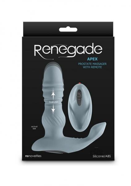 Reach new heights with Apex by Renegade. A stylish and inviting massager designed to stimulate the prostate and testicles with precise thrusts and vigorous vibrations. Apex is made of sumptuously smooth body-safe silicone and includes a wireless remote for countless exciting possibilities. Remote requires 1 AAA battery (not included). Rechargeable. 6 speeds / 8 functions. Suitable for use with all lubricants, including silicone.