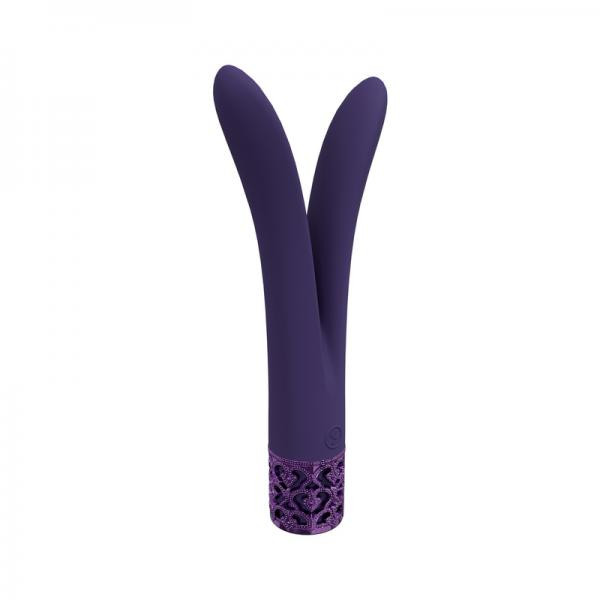 You don't need to be royalty to enjoy this elegant line. Hidden beneath it's silky-smooth medical grade silicone exterior lies a pedigree unmatched. The Dueling Queens unique V-shape is perfect for internal or external stimulation that will expand your boundaries of pleasure. Its two magnetic fully rechargeable proprietary New Generation F-1 motors deliver mind blowing vibrations uniformly across the full surface of the toy. Don't settle for the common, choose to be royal. Product dimensions: 7.05" x 3.23" Product diameter: 0.71" Quantity motors: 2 Rotations per minute: 10,000 RPM Speed modes: 10 Multi speed: Yes Rechargeable: Yes Rechargeable time: 90 min Recharged battery lifetime: 60 min Waterproof: Yes (IPX6) Phthalate free: Yes Materials: Silicone, ABS