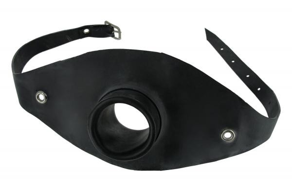 This is an excellent 100% rubber open mouth gag. The mouth piece is made of heavy rubber keeping the mouth from closing. The hole is a whopping 1.5 inches in diameter and protrudes 1 inch into the mouth. <br /><br />Measurements neck strap adjusts from 17 inches to 20.5 inches around. Gag tube has 1.5 inches inner diameter, and 1.85 inches outer diameter. Materials Rubber with Metal grommets and buckle, Color Black.<br /><br /> Warning: this is a NEW item that is not in retail packaging, usually a plain box, wrapped in plastic or a poly bag.