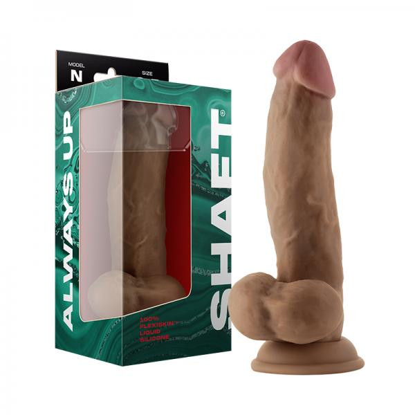 Crafted to perfection from innovative FLEXISKIN™ liquid silicone, these hyper-realistic, dual-layer dildos feel like the real thing and are ALWAYS UP™. Experience dual density like never before. Our proprietary FLEXISKIN™ liquid silicone gives SHAFT an irresistibly soft and silky real feel, while the firm silicone core provides enough support for even the most wild rides. Model N features an anatomical side curve with balls and a powerful suction cup that is harness compatible. Size: 8.5" Insertable: 6.1" Diameter: 1.79"