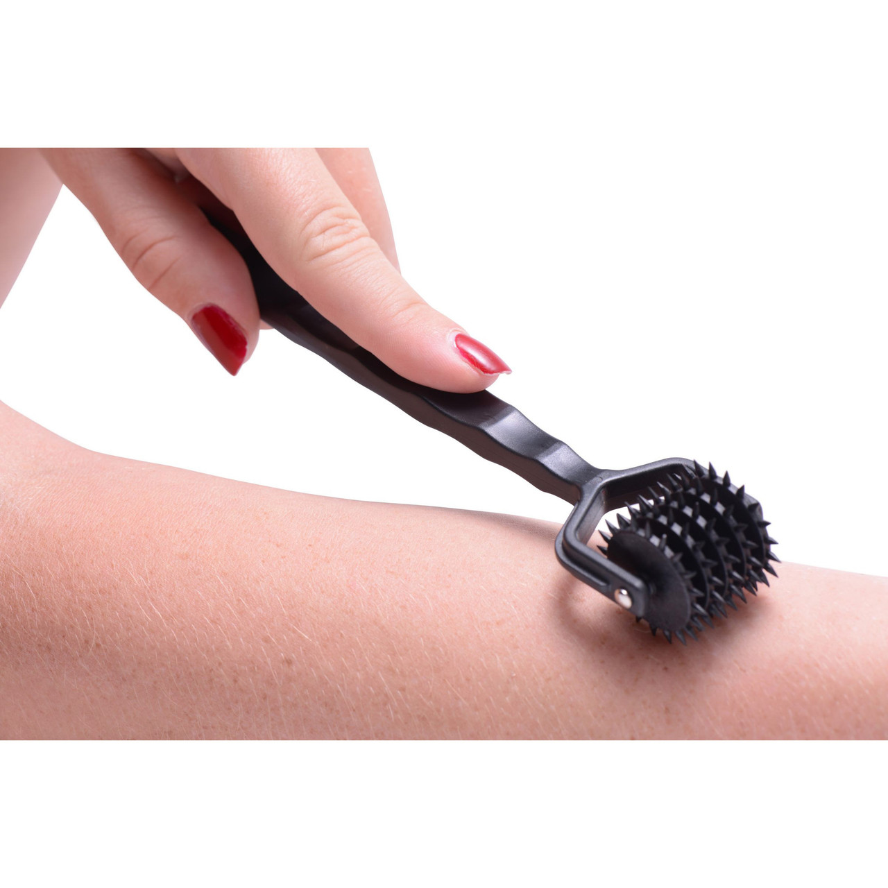 This modern take on a Wartenberg wheel features a row of 5 spikey pinwheels for your pin-pricking pleasure. The ergonomically-shaped handle allows for good grip in those hot and heavy moments when you want to deliver a subtle but sharp sensation. The smooth rolling motion will glide over the whole body, dipping easily into those most sensitive spots. Ideal for sensation play, this device pairs well with a blindfold to keep your partner guessing where they will feel that delightful sting next. Lightweight and travel-friendly, this pinwheel is a simple way to spice up any sexual experience.