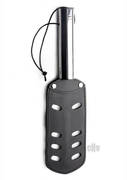 Make an impact with this heavy-duty paddle, featuring holes that allow air to pass through for a more aerodynamic swing. You will be able to hit flesh with more swiftness and power, delivering harder strokes and more painful pleasure. The sturdy, thick leather is no joke! The metal handle adds a cool weight to your control. A loop at the end can be worn around your wrist for more security during use, as well as utilized for hanging storage. Your masochist will fall in love with the intimidating appearance and follow-through of this tool. Measurements: 17.25 inches in length, 4.5 inches in width. Paddle is .3 inches thick Materials: Leather, metal Color: Black