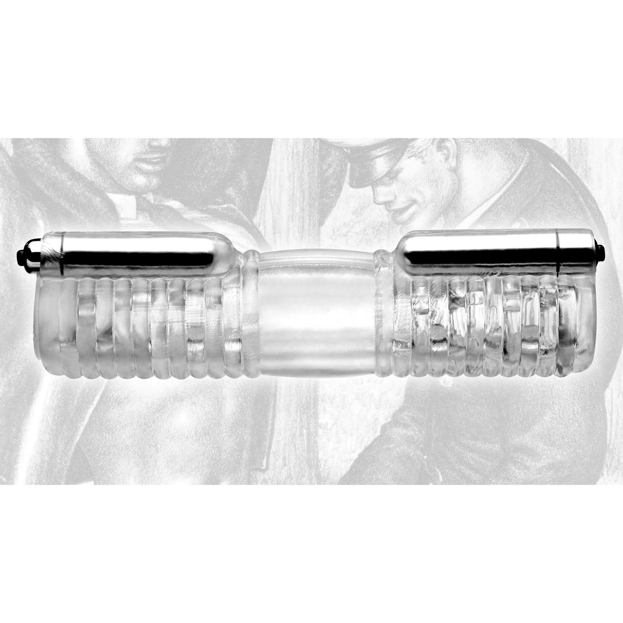 Go head to head with this vibrating double stroker. Powerful dual bullets stimulate the shaft as the stimulating textured interior grips your cock tight. The no-slip texture on the outside lets you get a firm grip, while the see-through material lets you get a good look at all the action. Hollow all the way through, so you can bottom out against the cock head of your partner.