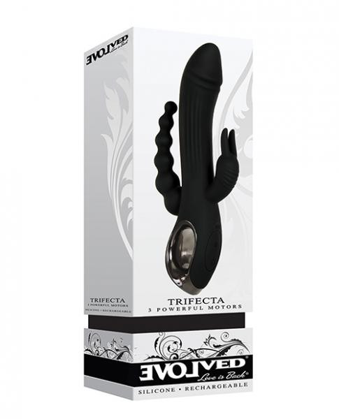 Trifecta Black Rabbit Vibrator from Evolved Novelties. Discover the most intense and deeply fulfilling orgasm possible, the trigasm! Stimulate three erogenous zones at once to experience other-worldly pleasure that will leave your knees weak. The realistic phallic shaped main shaft delivers powerful internal vibrations while the clitoral stimulator buzzes your climax zone with hard working bunny ears. Meanwhile, the beaded anal shaft gently and gradually slips inside your back door to complete the tantalizing trifecta of pleasure! Find the right rhythm for your unique taste, enjoying three motors in all, and explore your trigasm in the bath or shower as it is completely submersible in water. Large triple stimulation vibrator Targets 3 erogenous zones for intense orgasms Phallic shaped main shaft with textures Rabbit shaped clitoral stimulator Graduated beaded anal stimulator Flexibility in all shafts to move with your body 3 motors, one in each shaft Main shaft controlled independently Clitoral and anal stimulators controlled together 10 powerful vibrating speeds and functions in each motor Easy to use 3-button control panel LED lights illuminate buttons when in use. Size 8.5 inches by 3.59 inches by 1.52 inches. 5 years warranty from Evolved Novelties.