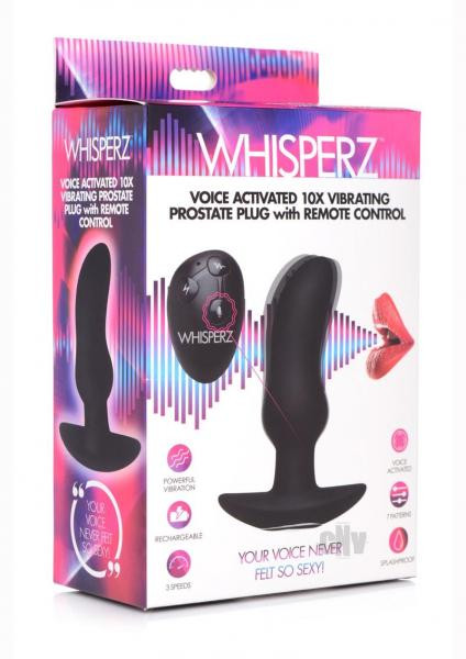 Your voice never felt so sexy! This exciting Whisperz prostate plug is designed for unpredictable remote partner play with its cutting edge voice activated technology. The included wireless controller lets you or your lover please your prostate with little more than a whisper from up to 25 feet away!This vibrating plug is perfectly shaped for peak prostate pleasure - slightly curved with a mild bulb to directly stimulate the male P-spot while providing a satisfying fill for you to squeeze on. Choose from 10 patterns of vibration to voice your love into the ass of your man!Need to play with a little discretion? All functions can be controlled with the buttons instead of microphone if you want to tease your partner in secret! Insert and take a walk around the neighborhood or use in the comfort of your own home for voice activated prostate pleasure wherever you want.This voice activated prostate plug can also be activated with loud music! Place the remote control near your speakers and play some tunes appropriate for a proper prostate milking!Made with phthalate free, velvety smooth silicone for a body safe and luxurious feel. IPX5 waterproof for ease of cleaning before and after use and shower friendly play! Rechargeable via included USB charging cable for endless voice activated fun.